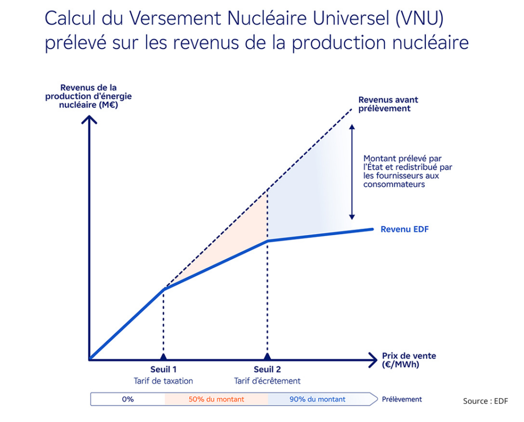 Ainsi, lorsque les revenus annuels du parc nucléaire historique dépassent un seuil défini (entre +5 et +25 € par MWh) par rapport à ses coûts complets, alors 50% du bénéfice sont prélevés. Et s’ils dépassent un second seuil (entre +35 et +55 € par MWh), le prélèvement passe alors à 90% du bénéfice additionnel
